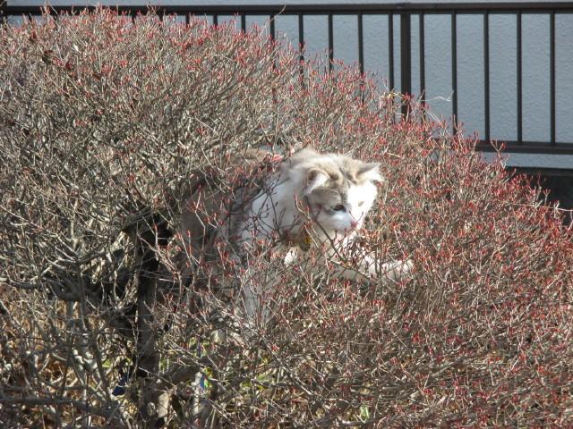 高さ1m程のドウダンツツジに強引に木登りです(笑)