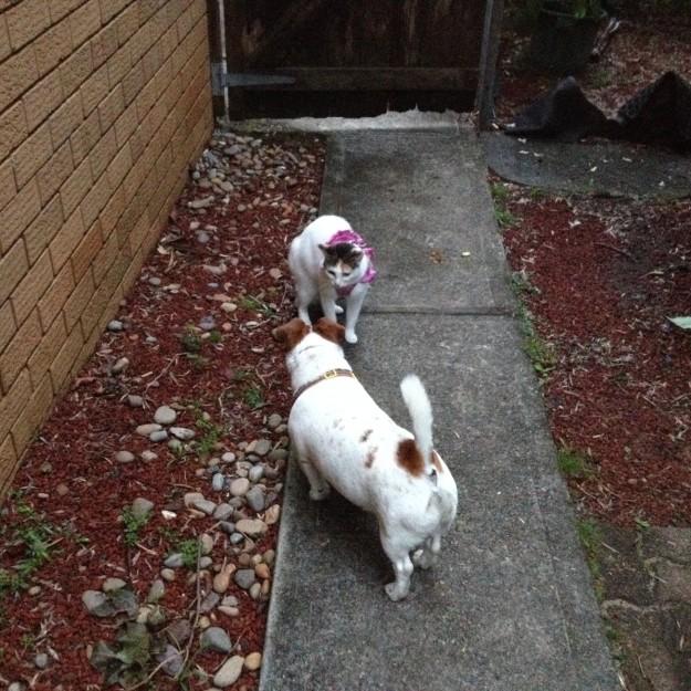 Euronくんは 猫ちゃんにはフレンドリーなのに、じーちゃんの犬には アグレッシブに