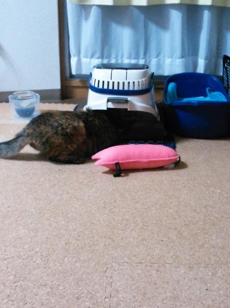 ところで、世唯ちゃん食欲はないけど愉快な遊びを思いついたようですね。キャリーの上部を置いておくと入りたがります。姉御、尻が隠れていませんよ。