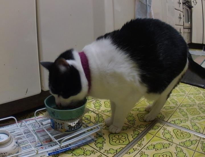 その寒い台所へ、わざわざやって来て、ご飯を食べるハチ君。