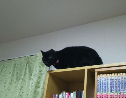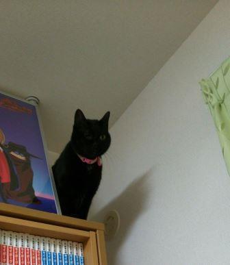 昨夜は本棚に上ってました。ここまで自力で上がれるのに、何でクローゼットは自分で上がらないかなあ。