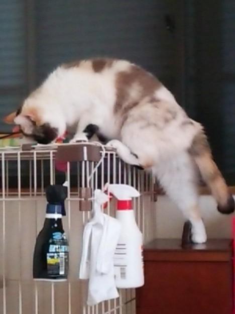 それよりも、ベルのケージの上のオモチャが気になるようで必死です
