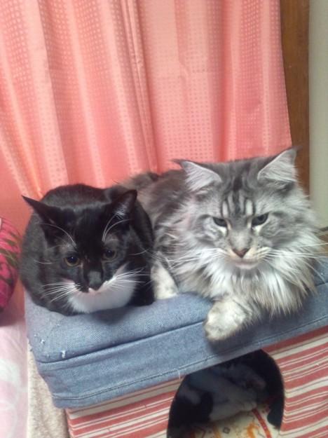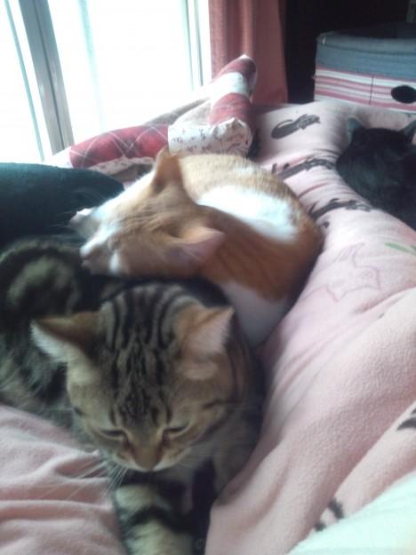 今朝のニャンズ。私の足や腰を枕にしてピッタリ寄り添って