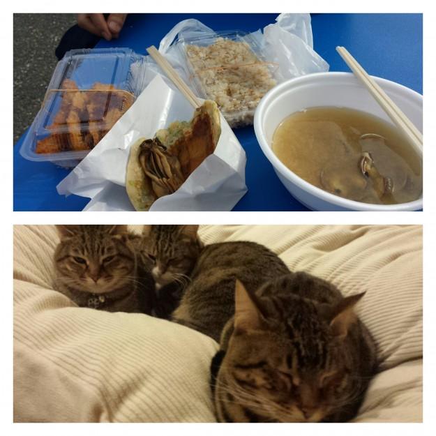シラスごはん、オキギスのフライ、あさりの味噌汁、牡蠣蒲(カキカバ)サンドです。