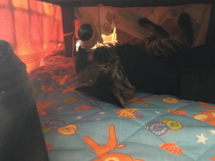 見かねたママンが古い敷物を入れてあげたらやっと入りました。