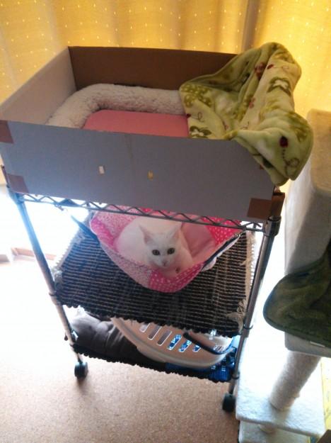 スチールラックも使えるもんだなと、しみじみ思いました。写真撮ろうと近づいたら世唯ちゃんは猛ダッシュで逃げちゃったので、モデルは胡兎ちゃんにお願いしました(いや、お願いしなくても居座り続けただけだけど…)