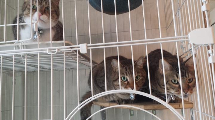 洗濯物を干す時は、突然ベランダに飛び出さないようケージにインされるニャンズ。