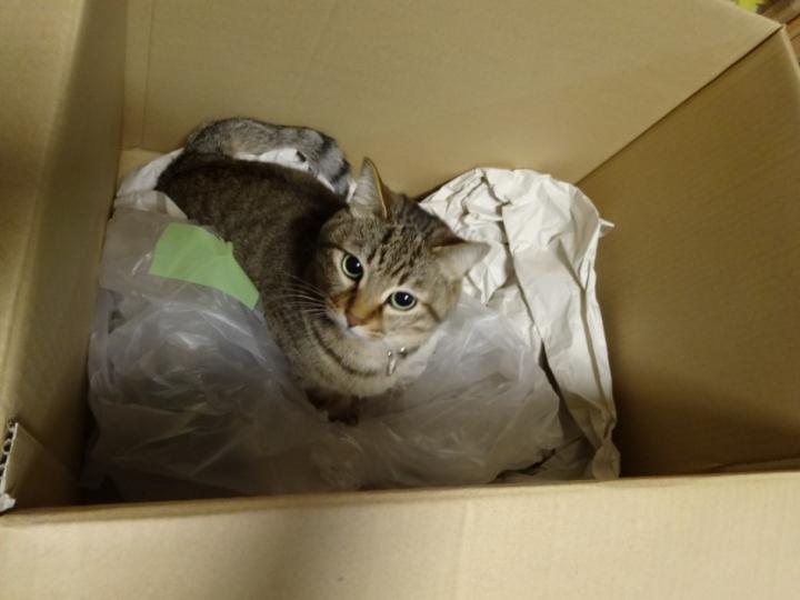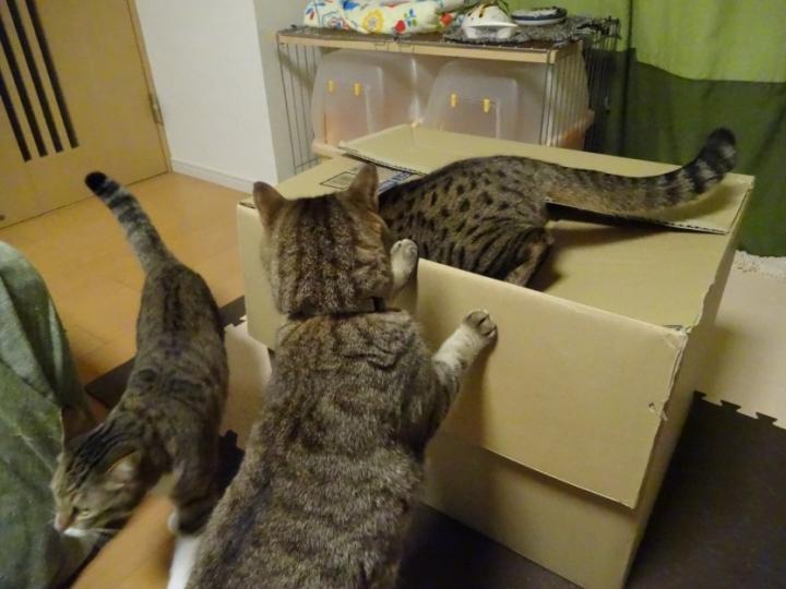 ダンボールを開けようとするそばから、中に侵入しようとするし・・・。
