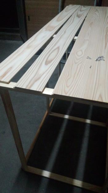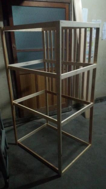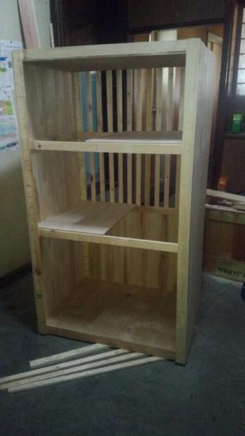 天井と底に板を張り、2段目と3段目に支え付けてから棚を設置