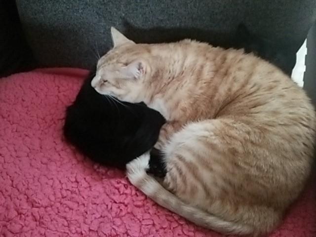 コタツで寝ている旦那にピトッとくっ付いて寝ているベルたん星人