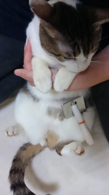 ブラシを見せながら「りょうちゃん。とっきーやで、ゴロンして~~」