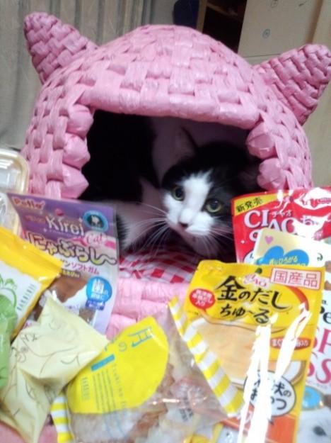 ちぐらのほかにも キャットニップの苗や、ガリガリサークルや にゃんこのおやつ&ワタクシにもおやつをいただきました(嬉)