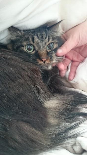 布団に潜り込んだのに、見つかっちゃってビビるテオくん(^^;