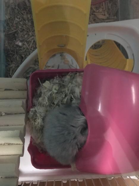 ゲージ内の寝床に綿と敷草を詰め込みまくっているププさん。笑