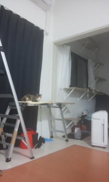 キャットウォークの横が、猫が外を眺める用の高めの作業台で、その隣が、日向ぼっこ用の作業台。