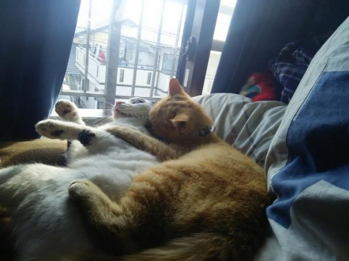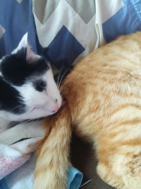 虎太郎が寝ていたまろ介にぴったりと寄り添うようにしたら「ウニャ、何事? 」と起きてしまった図
