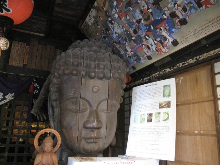 大仏の頭のみ。三つの木材を合わせてから彫ったのか、三等分に斬られた生首のようです。以前山形にも9mになる木像の大仏があったそうですが火事で焼けてしまい、復興を試みたものの資金不足で頭部しか作られなかったそうです。