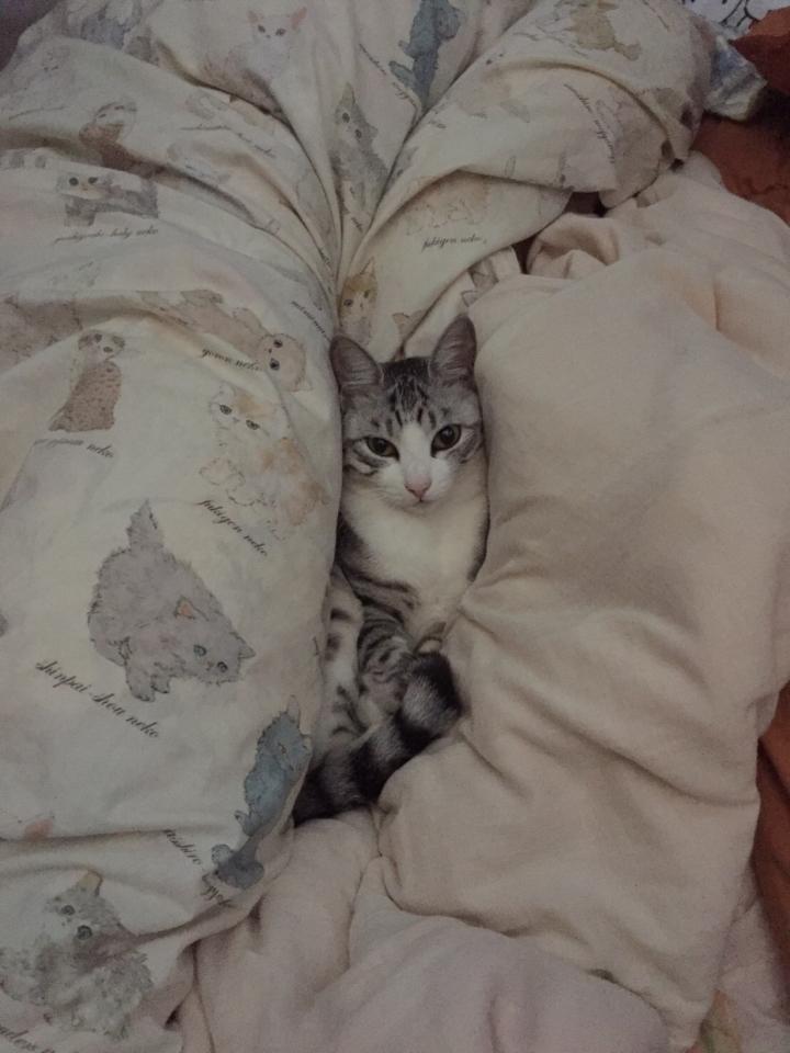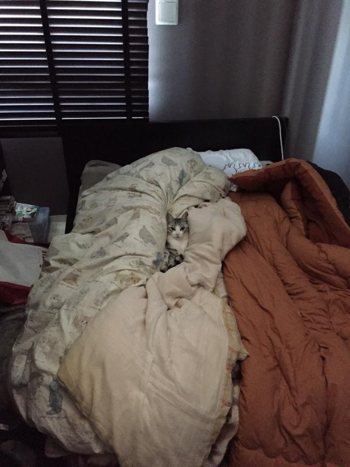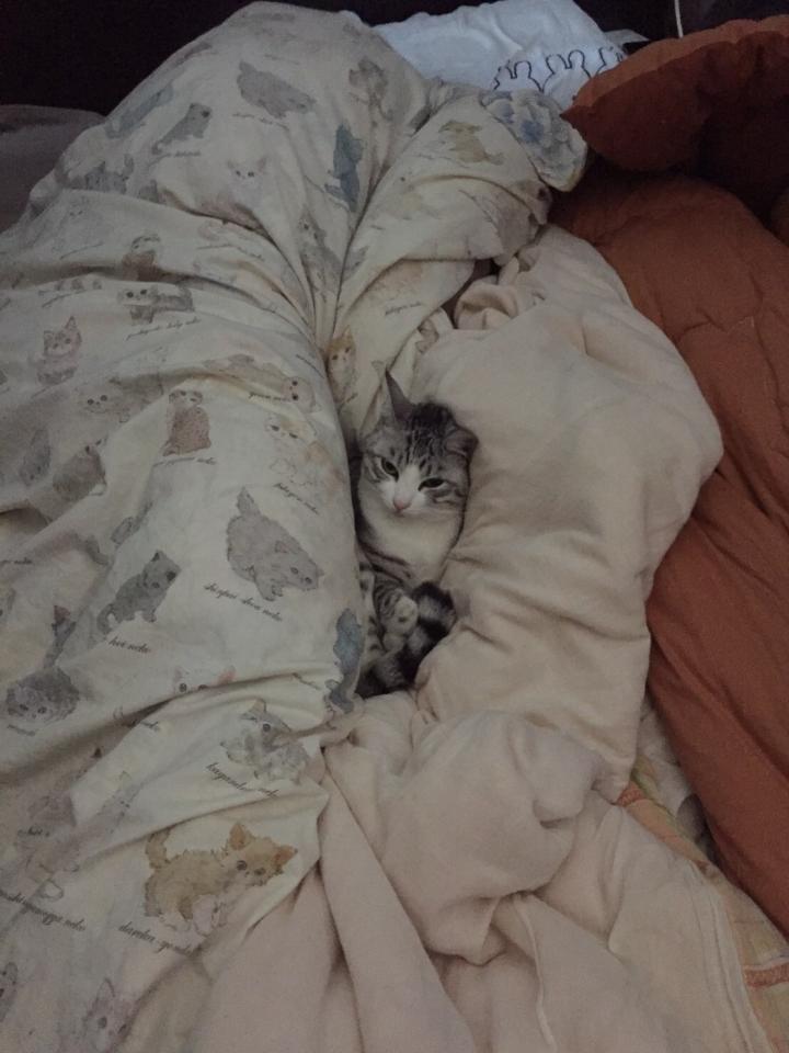 布団が毛だらけなのと、古い掛布団で染みのあるのが写っていてお恥ずかしいですが。