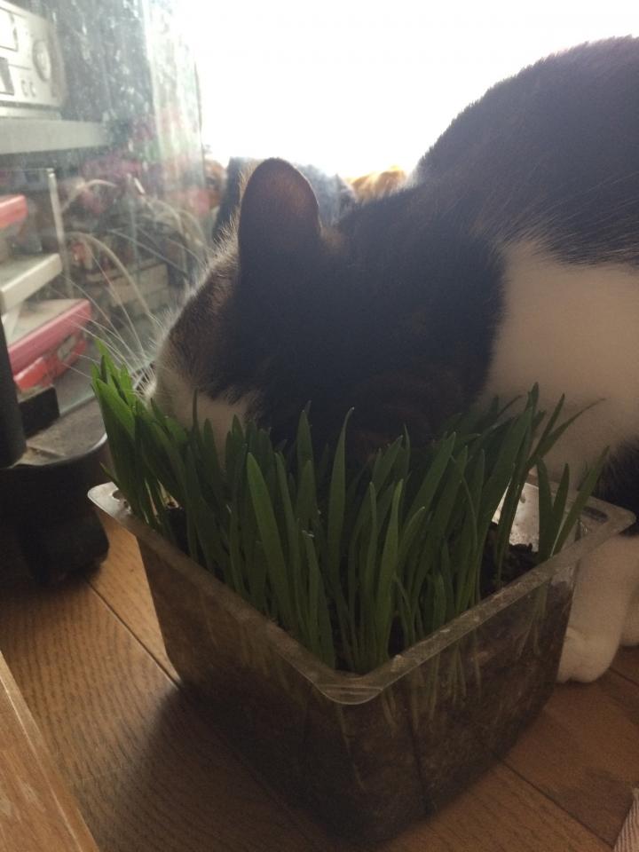 春になり、マロの大好きな、ネコ草が育ちました。顔をつっこんで食べてました。