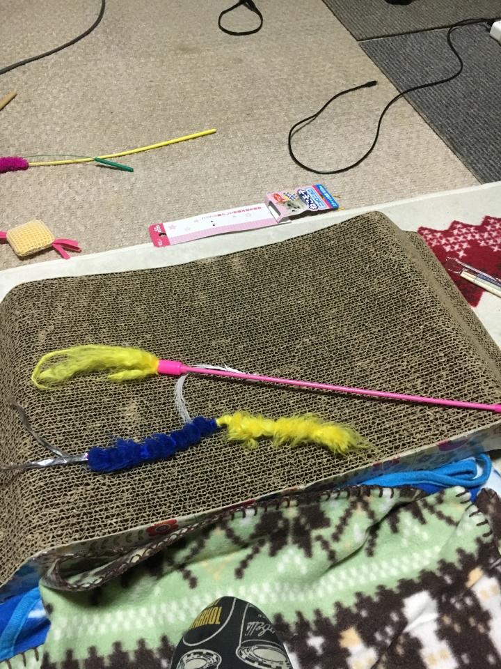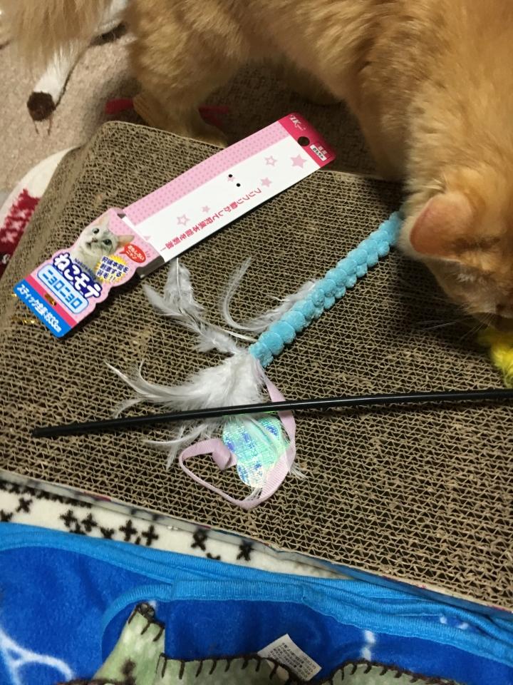 猫のお遊び草とねこモテニョロニョロですが、ニョロニョロの方が先端部分に羽毛がついてるので食いつきがパナイです。出してすぐに羽毛2枚むしられました。