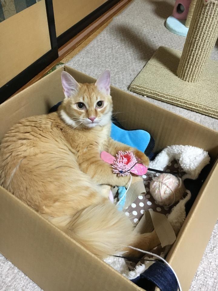 遊んでて捉えた獲物は段ボールに持って行くのがルーア流です。