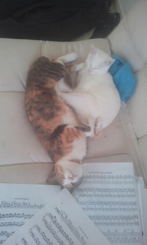 ↓わざわざやってきて、楽譜の上でじゃれあって