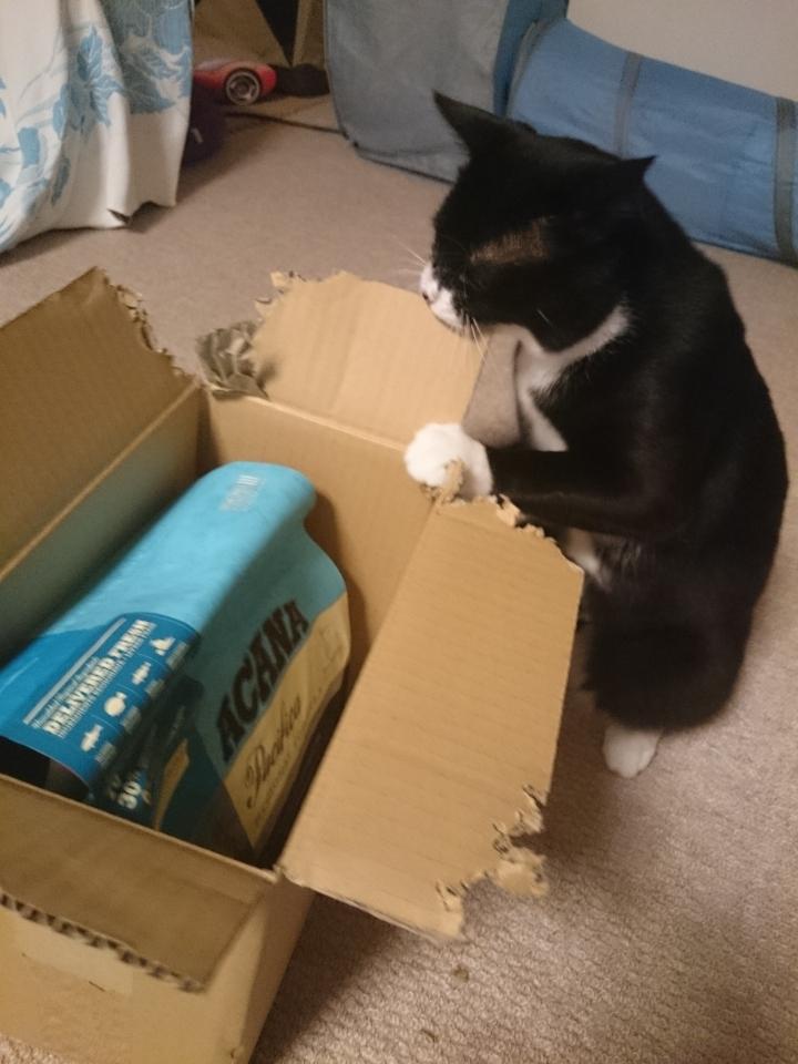 去勢前には、しなかった段ボールを噛みちぎって遊ぶって技を最近覚えたらしく、食べたら嫌なので心配性の私は、段ボールを隠しておりました。
