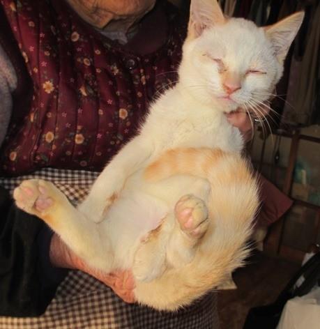 おばあさんに抱かれたしろちびですが、目も満足に開けることができない状態なのに、里親募集をしてしまいました。