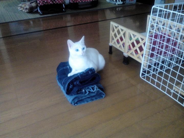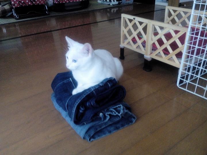 「ニャンにゃー♪」(洗いたてのジーンズは気持ちが良いニャン♪、ご飯台はいい感じだニャン♪)