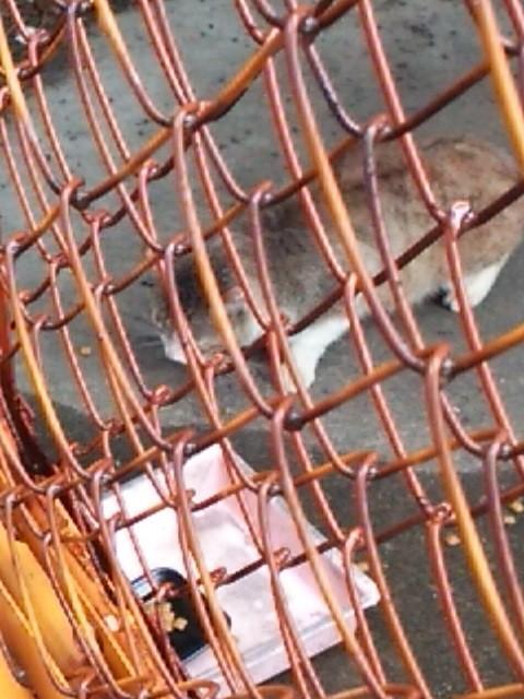 紐で結ばれたエサ入れがあり、たぶん餌を入れて自転車置き場内へ押し込むのでしょう