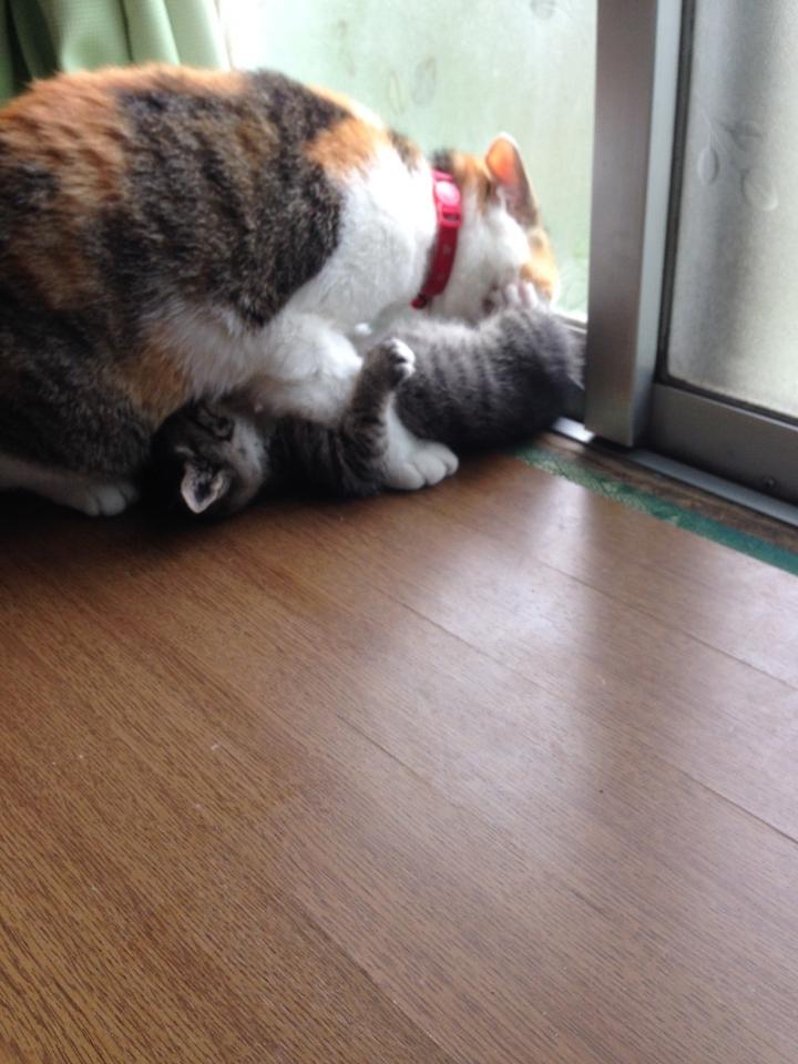 幸い、攻撃的な態度を示す猫は無く、三毛のチビは、身体を舐めたり遊び相手になったりと、お母さんの様に接してます。