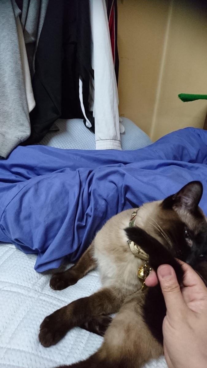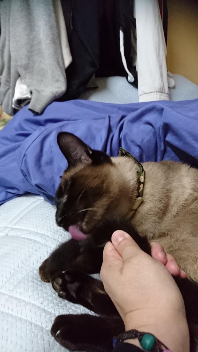 ママが撫で、尻尾を触ったら ママに尻尾を持たせて尻尾の毛繕い。