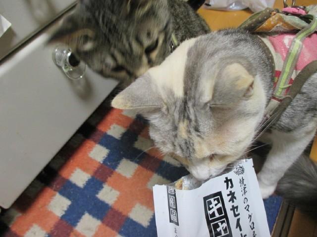 開封したらマグロのいい匂い、あげる前に今夜のごはんと感ずかれました。