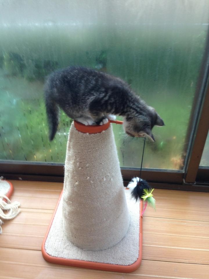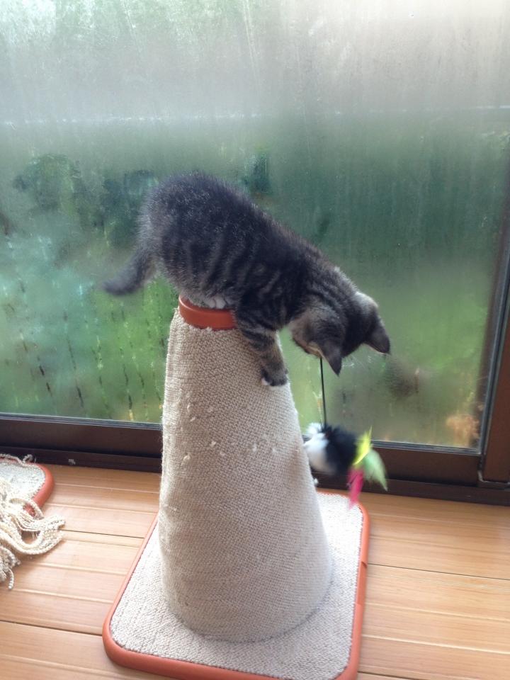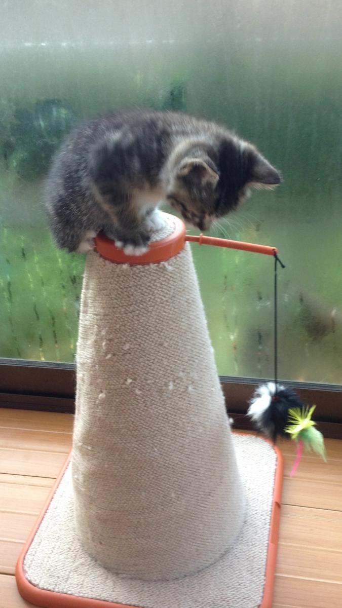 タワーのてっぺんの小さなスペースに乗り、オモチャにじゃれてます。