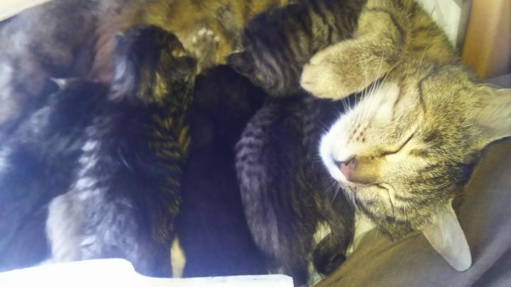 目も開き順調に生育してますが、母猫が何故か飼育箱より子猫を本棚横の狭いスペースに移動しようとします。
