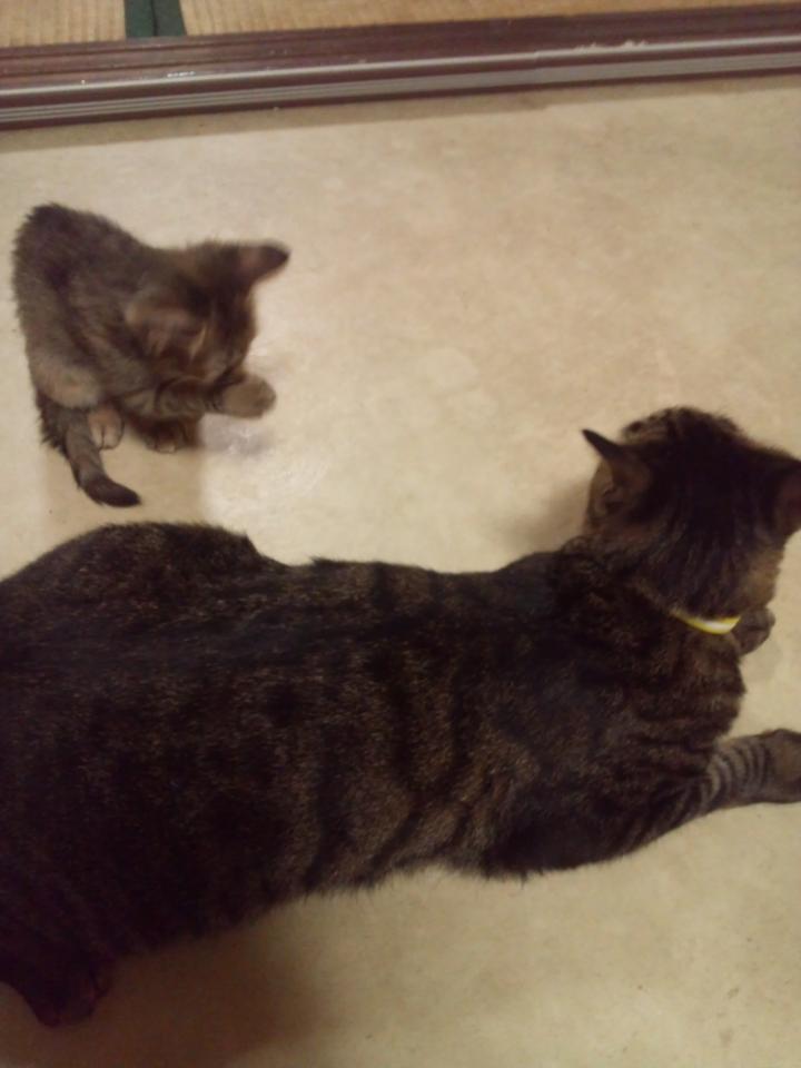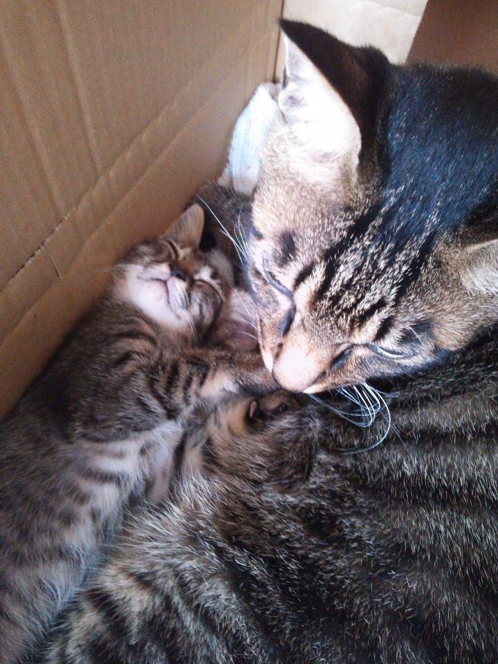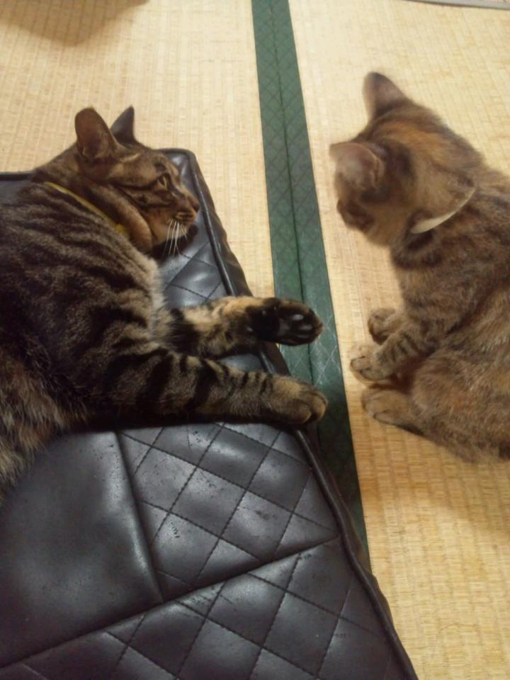 親猫はいまだに過保護で自分の子を面倒みています。母猫は自分より大きくなった娘が一声鳴くだけで走って行って毛づくろいする始末。