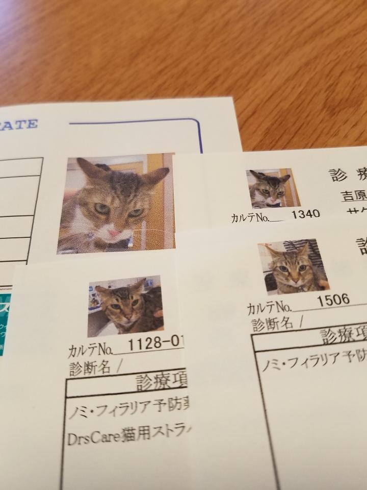 そしてかかりつけの病院が最近始めたようなんですが、ワクチン接種証明書と領収書にニャンズの顔が載るようになりました。