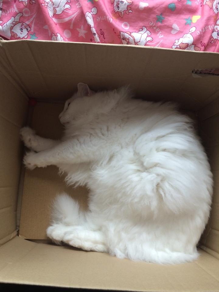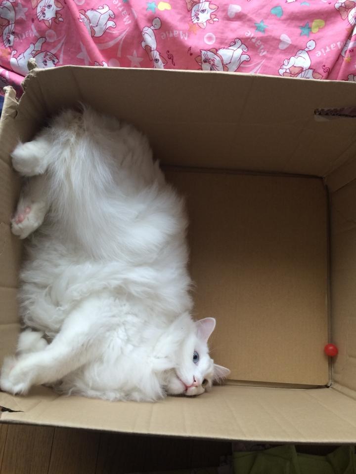 昨日の夜、片付けをしてたら、空いたダンボールにイン。