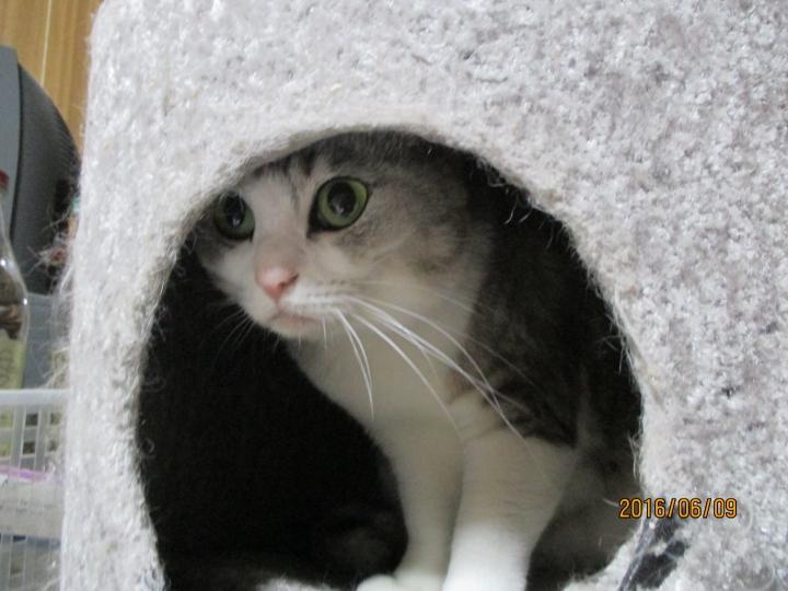 キャットタワーの中にぎうぎうにつまる事らしい・・・ですf(^^;。。。
