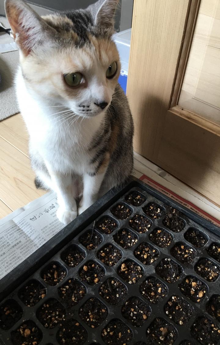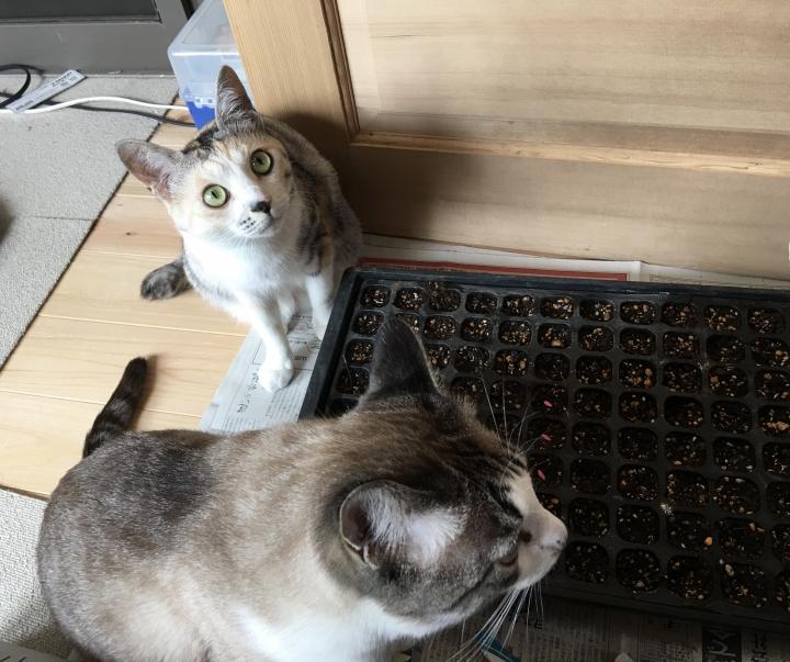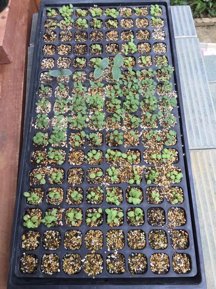 新しい苗を作るため、10日ほど前にプラグトレーという容器に播種(種まき)を行った。