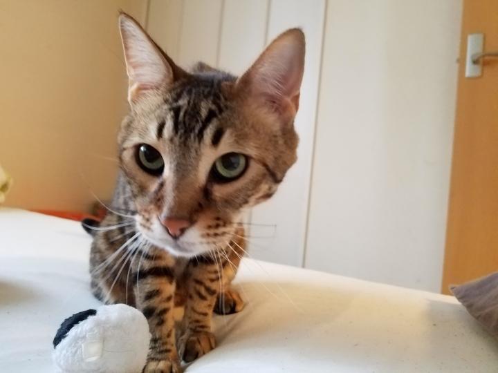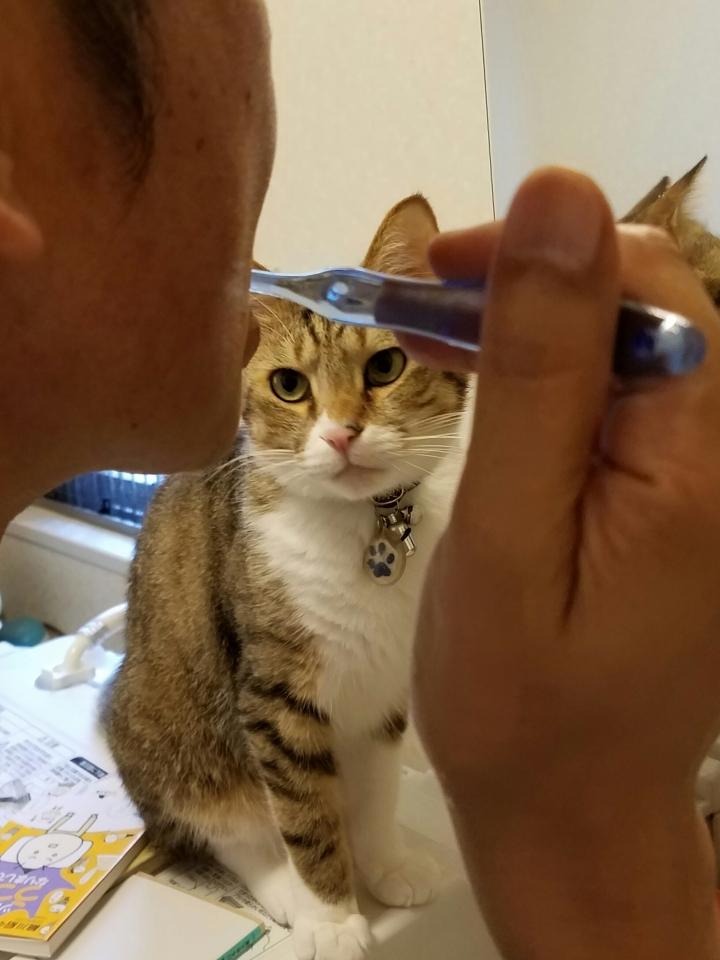 歯磨き粉のニオイが嫌なのか、目がシュンシュンしてるのに見つめる意味がわからない…。