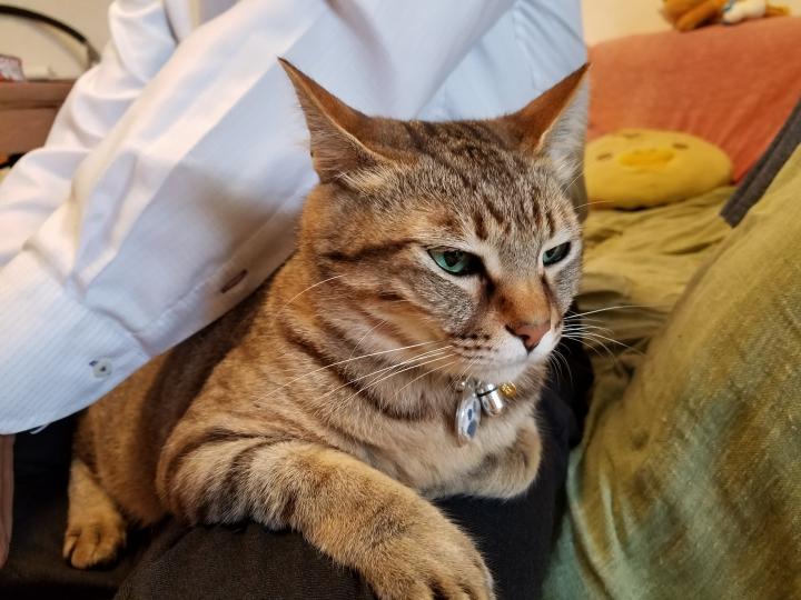 出勤前に着替えたおとさんの膝の上で、ドラくんはウトウト💤