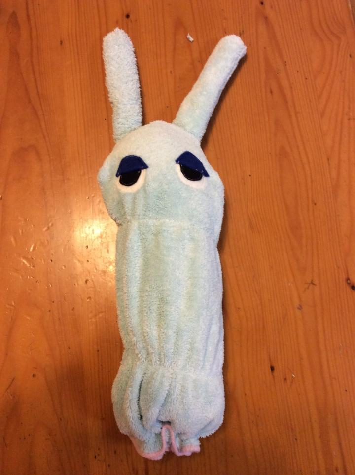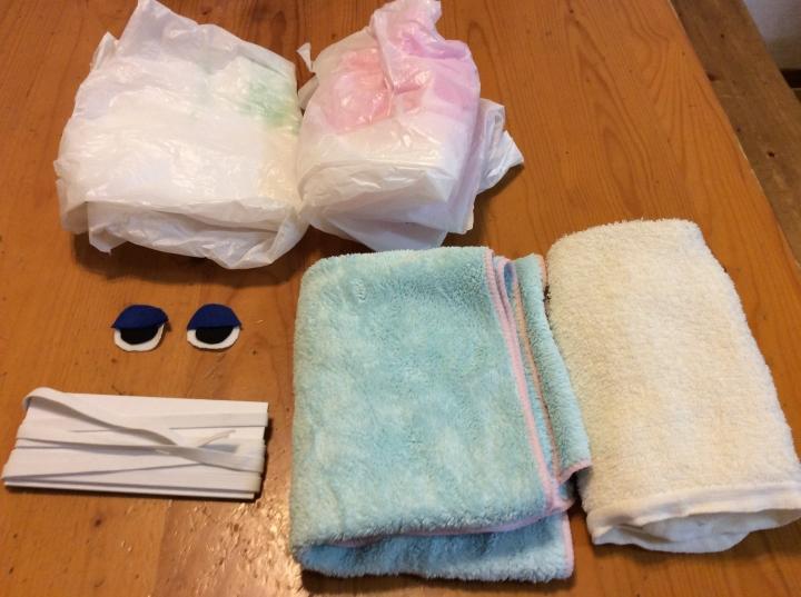 タオル1枚にスーパーの袋を巻いて中に入れてます。カシャカシャするので良い感じ。