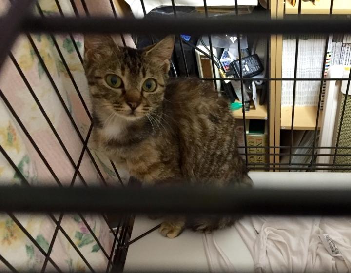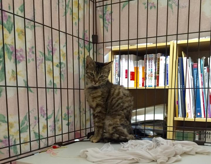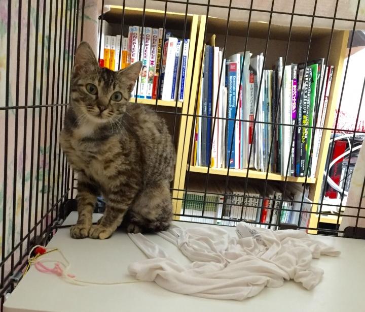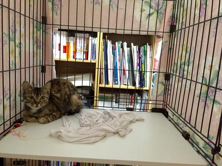 保護してからずっと、キジトラさんは相棒さん(主人)の仕事部屋に隔離されています。