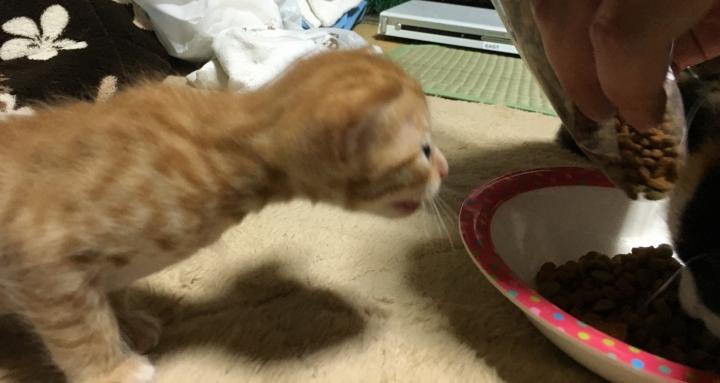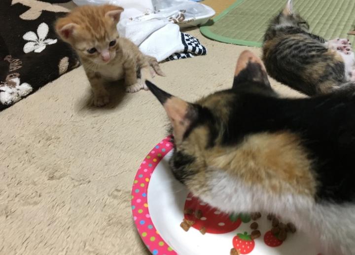 生後2週目の時も興味は持っていましたが、母猫が食べている音のする方に耳を澄ましているだけでした。