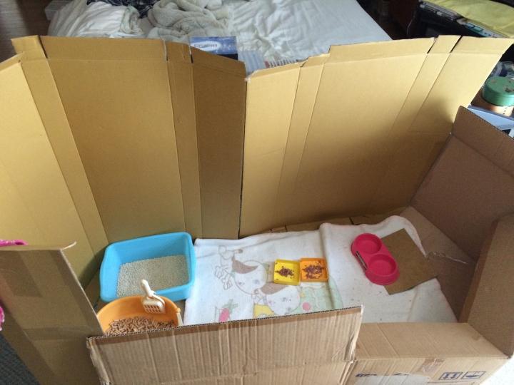 只今、2にゃんは、寝室の一角のダンボールハウスに住んでます。