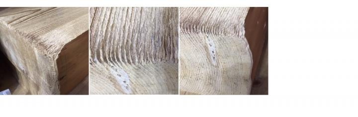 杉の厚い板を使っているので爪研ぎに絶好の場所。ミックがガリガリとやった痕😅
