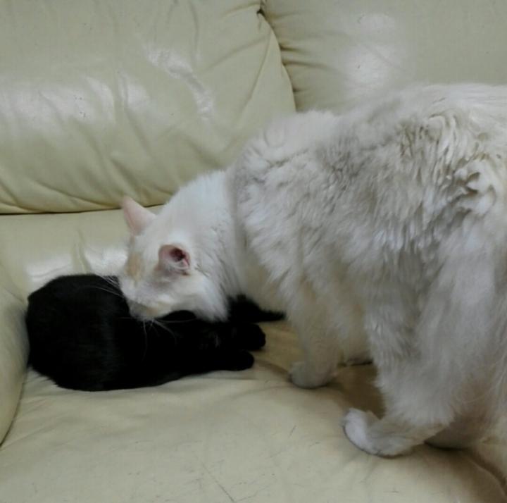 いつもと違うこてつ君に何か感じているのか、虎太郎がこてつ君の毛づくろいをしていました。