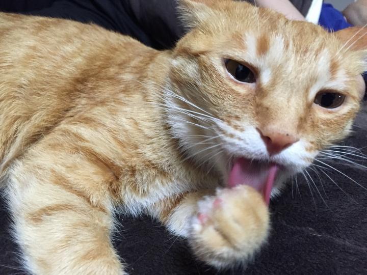 舐めてる途中でヘンなスイッチが入って興奮して、猫パンチで袋を叩き落として、指をめがけて噛み付いてきたらどうしよう⁈と不安になりながらも、幸せ&緊張感いっぱいな数分間でした(^◇^;)