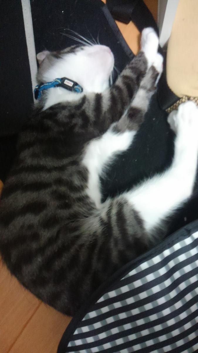 彼のお腹の上では2匹とも寝る癖に私とは一緒に寝てくれない(´;ω;)